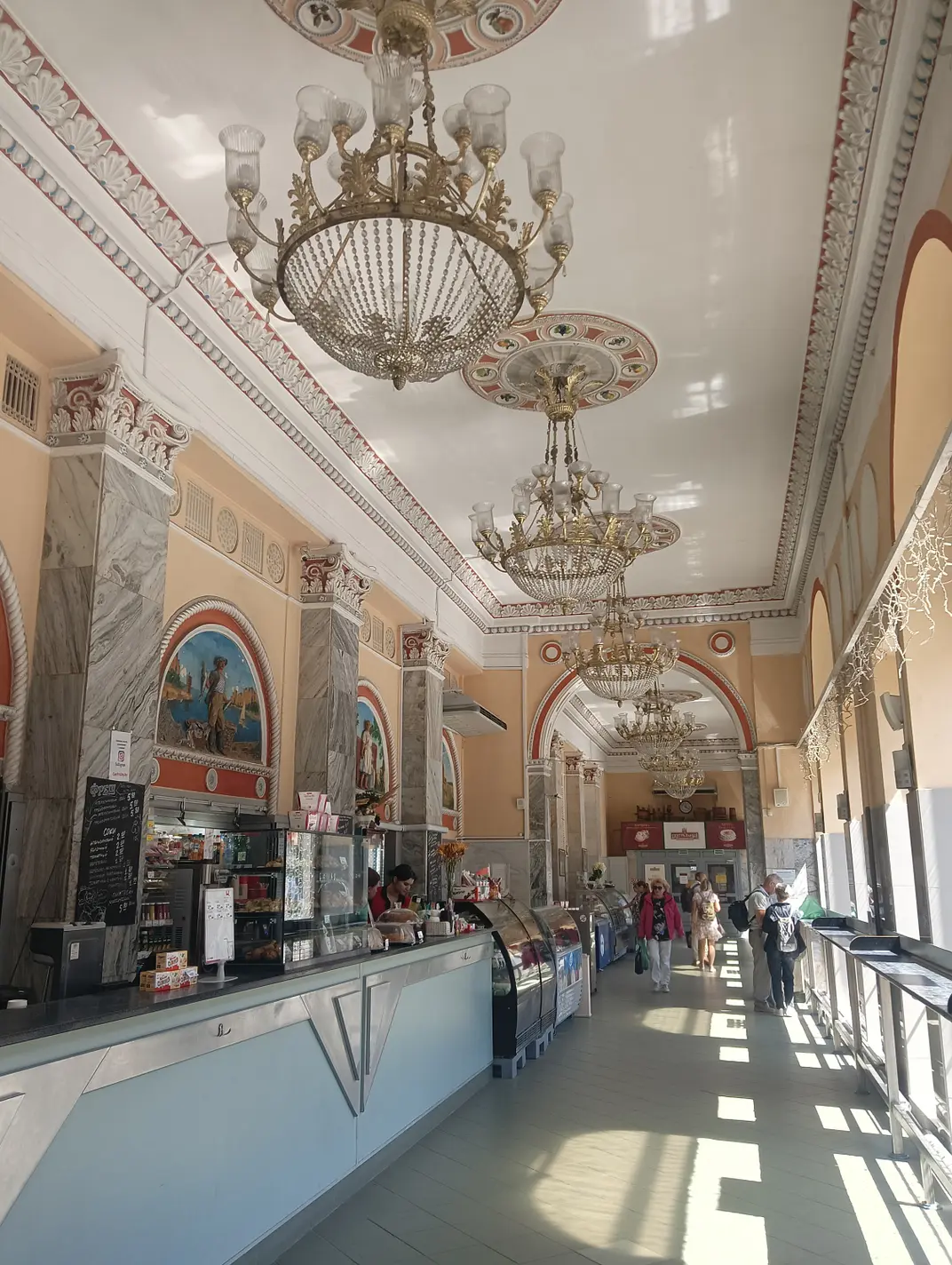 С потолка свисает огромная металлическая люстра. Кажется, она видела всё: времена дефицита и времена дикого капитализма.