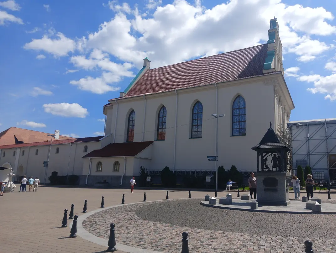 Первое, что встречается, когда поворачиваешь на проспект Независимости, — Костёл Симеона и Елены. Этот католический храм был построен в 1910 году, полностью разрушен в годы Великой Отечественной войны и восстановлен в 2006 году. Правда, его можно рассмотреть только снаружи — он не работает.