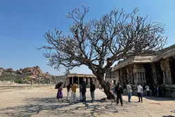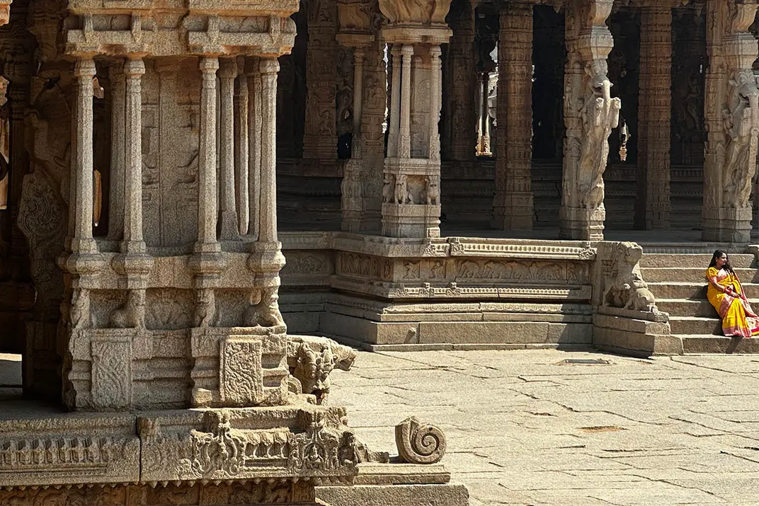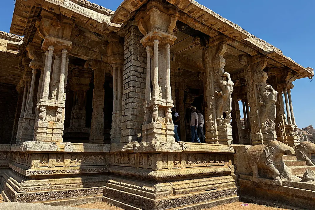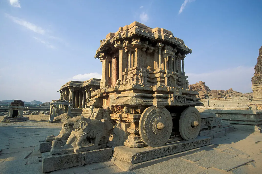В центре у входа в храмовый комплекс стоит огромная каменная колесница — архитектурный памятник, посвященный Гаруде, ездовому орлу бога Вишну. Это один из аватаров бога Шиву, которому поклоняются именно в Карнатаке. Вся конструкция покрыта тонкими барельефами с мифологическими сюжетами, есть слоны, которые ее везут. Строение было создано еще в ХVI веке, и якобы колеса колесницы изначально могли вращаться.