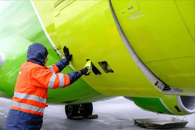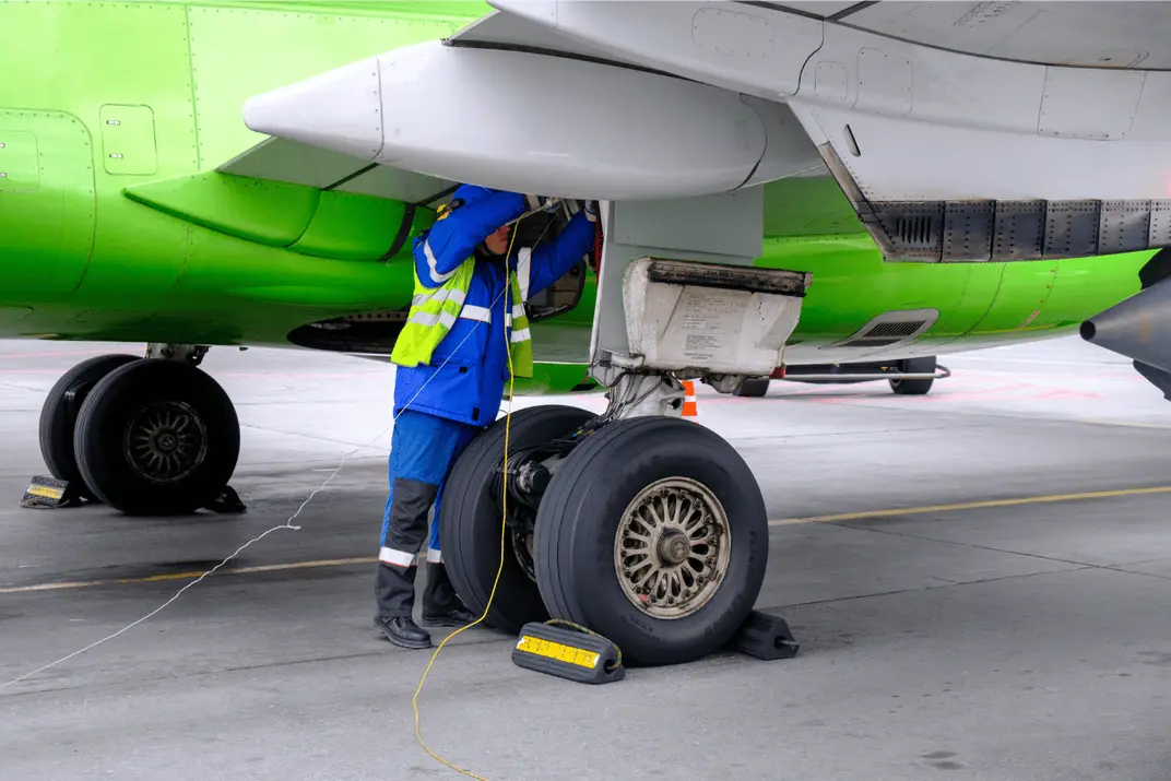 Перед стыковкой пассажирского трапа авиамеханик проверяет дверь, через которую будут выходить пассажиры. На ней не должно быть никаких повреждений.