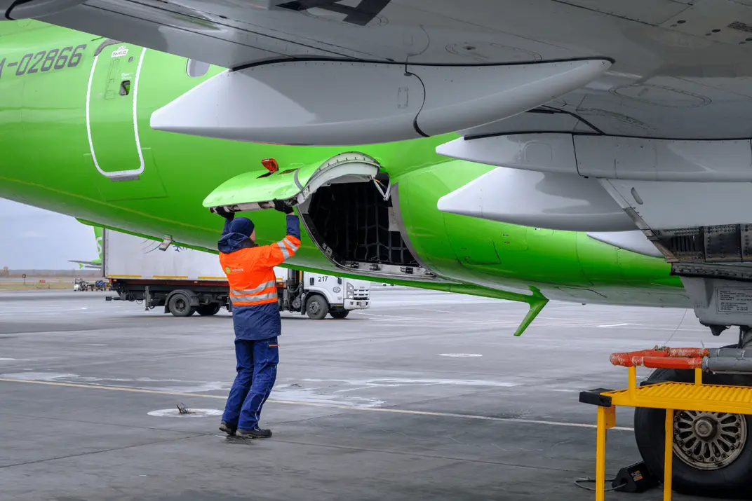 Параллельно к самолету подъезжают багажные тележки. Авиамеханик открывает багажные отсеки, и грузчики приступают к разгрузке: на эту работу дается 12 минут.