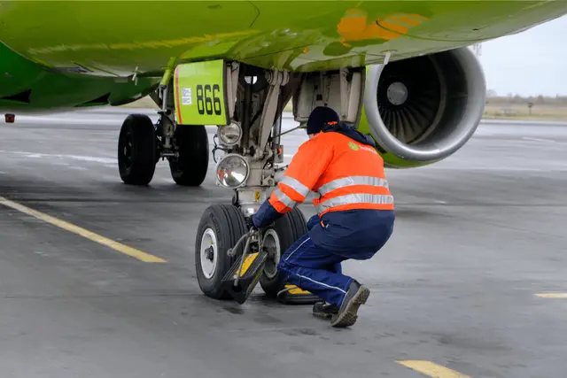 Пока пассажиры выходят, авиамеханик осматривает самолет снаружи: он движется от передней двери вдоль крыла, проверяет фюзеляж, двигатель, шасси, хвостовую часть. Его задача — убедиться, что нет вмятин, подтеков технических жидкостей и других повреждений.
