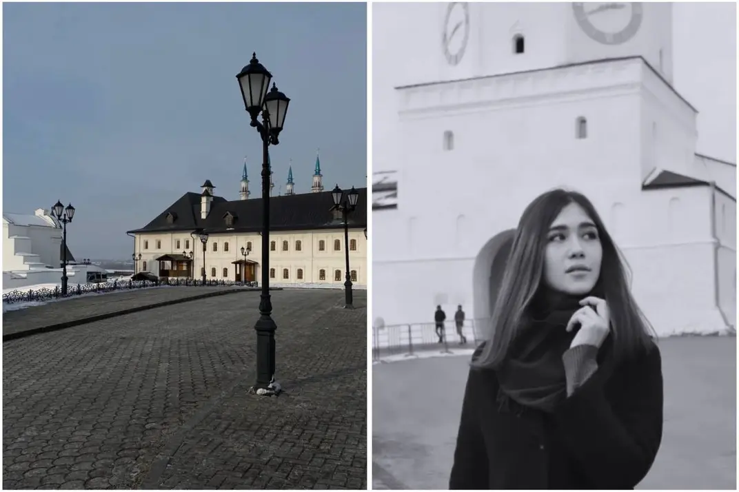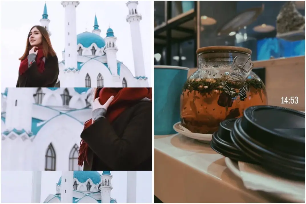 Слева — фото возле мечети Кул-Шариф, справа — ароматный чай, который подают в ресторане АК Чынаяк