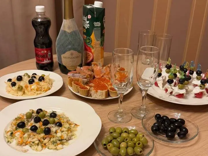 Наш новогодний стол в гостинице, накрытый на скорую руку из готовых салатов