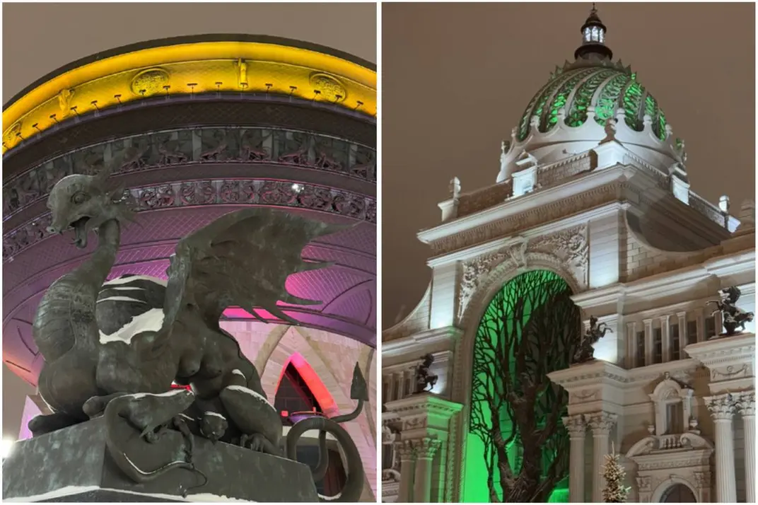 Слева — крылатый барс возле смотровой площадки, справа — Дворец Земледельцев