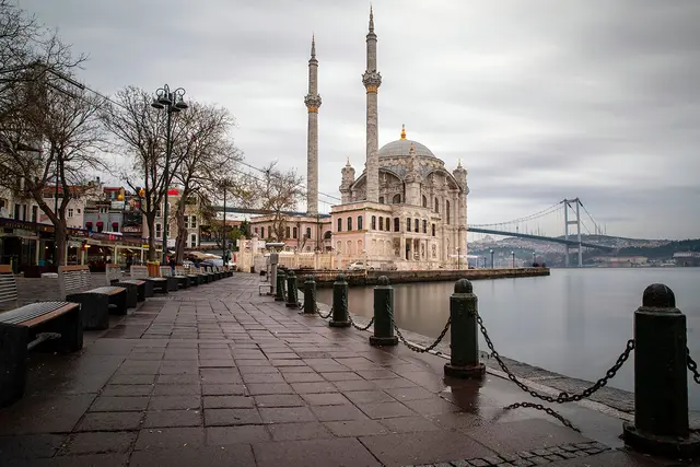 Рядом с Босфорским мостом находится красивейшая мечеть Бююк Меджидие (или Ортакёй) в стиле османского барокко. Внутри — арочные окна, расписные стены и огромные хрустальные люстры. Лучше приходить сюда вечером, чтобы заодно увидеть подсветку Босфорского моста.