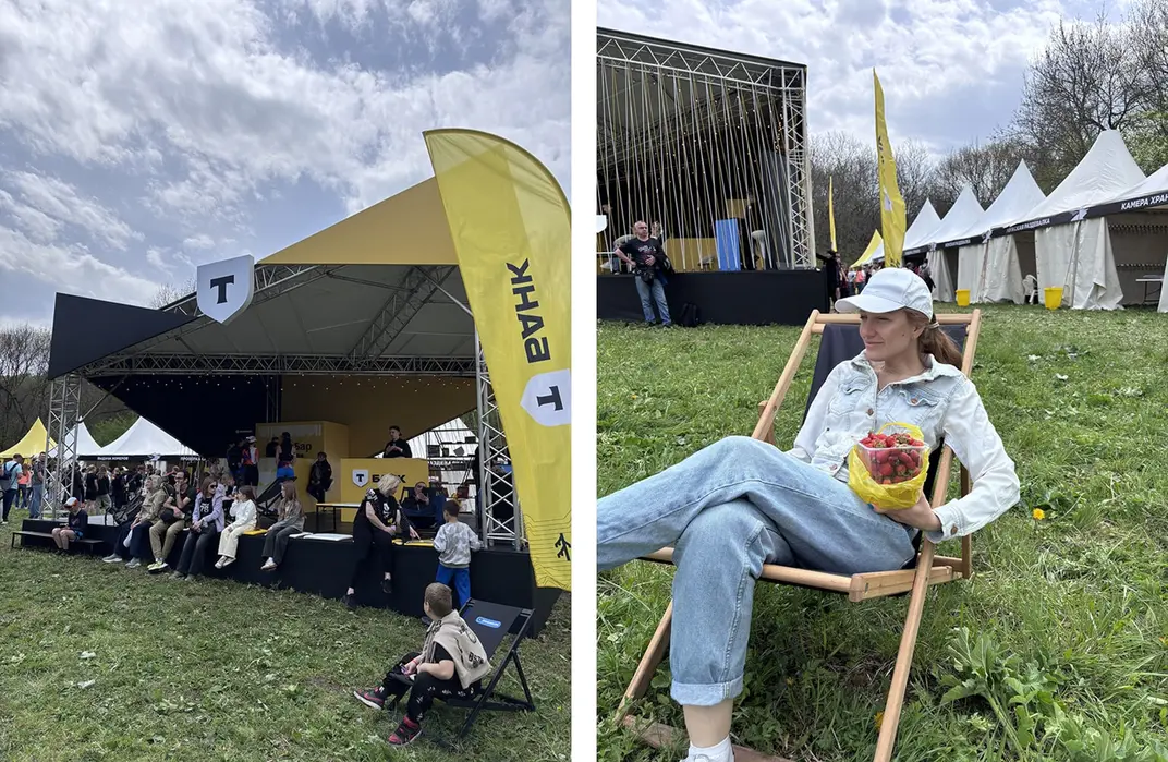 - Большая зона Т-банка. Можно было поиграть в настолки, нарисовать плакаты поддержки, полежать на лежанках, а еще угощали бесплатными напитками. Класс!