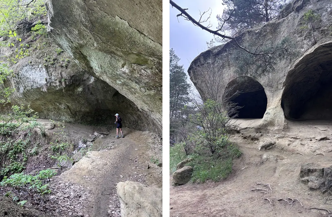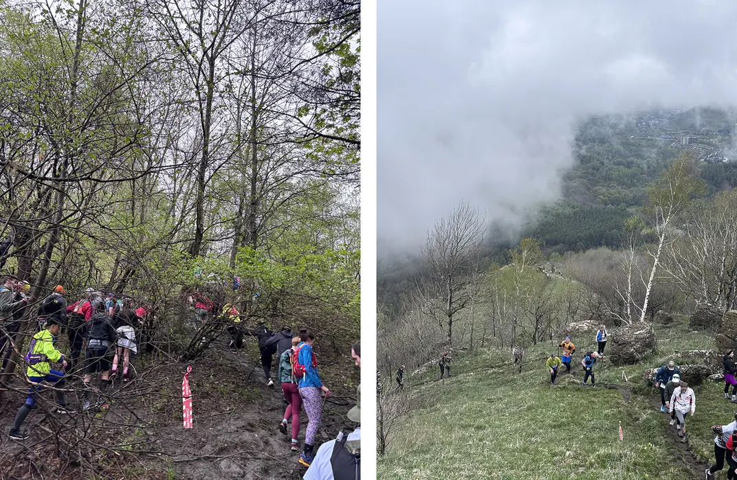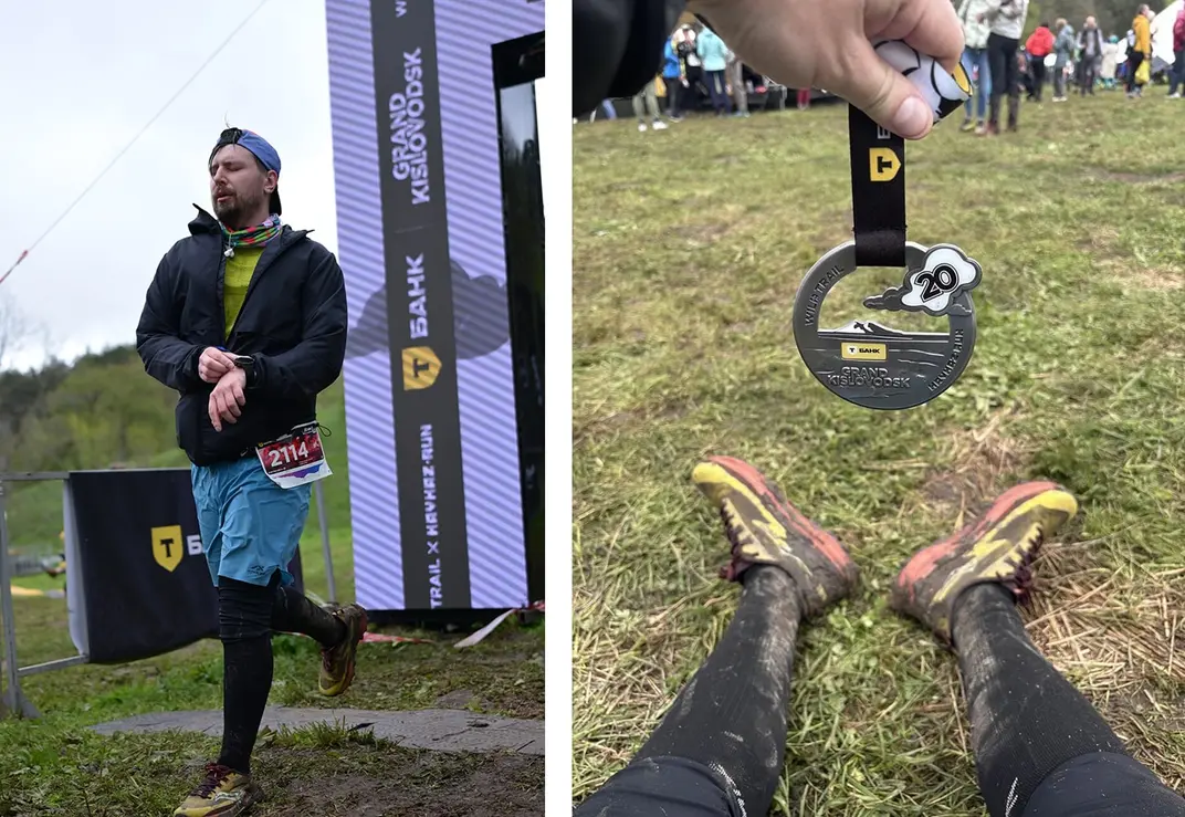 Но вместо подъемов появилась новая проблема — грязь. Земля после дождя превратилась в плотное месиво, которое липло к протектору и не отваливалось. На ногах были трейловые Saucony Peregrine 13, но даже в них бежать по такому покрытию было тяжело — казалось, что к ногам прибавили по +2 кг. Процесс бега местами выглядел так: бежишь, обтираешь грязь об камни или ветки, пробегаешь метров 500 — и снова чистишь подошву.