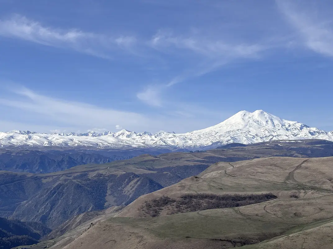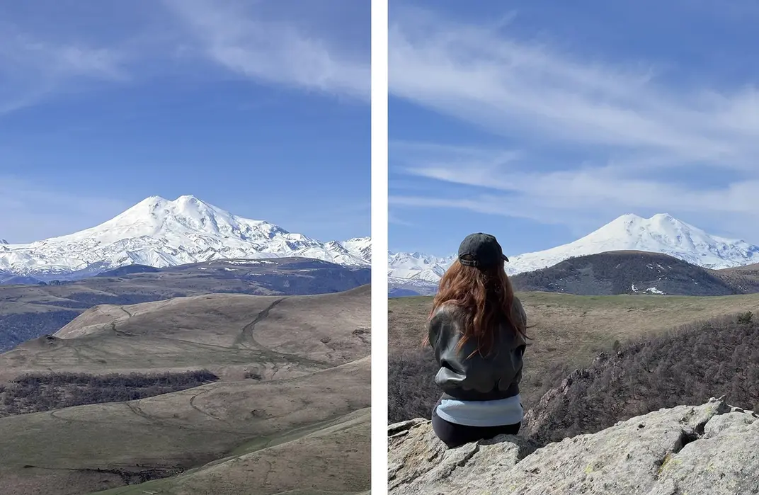 Для начала мы посетили две разные возвышенности с видами на Эльбрус. И тут с погодой нам повезло, потому что самая высокая горная вершина России и Европы была как на ладони.