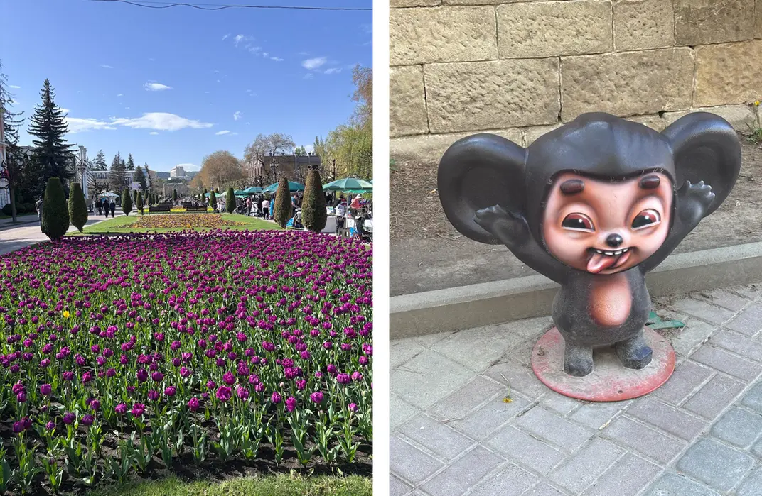 Наконец, после часов, проведенных в самолете и электричке, мы в Кисловодске, где встречает Чебурашка. Фигурки ушастого героя мультфильма стоят в разных местах в центре города.