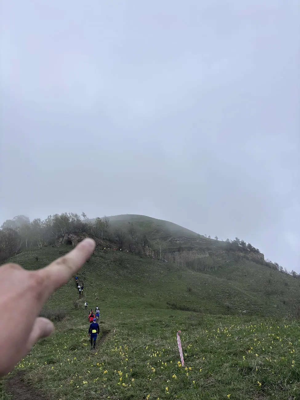 За первые 4 км набор высоты составил 420+ метров (при общем наборе 805). Первый пункт питания я встретил с огромной радостью, уже порядком вымотанный. Там я увидел основателя Wild Trail, поблагодарил его за забег и двинулся дальше — в туман. После перекуса прибавилось сил, и мы наконец выбежали на протяженное плато.