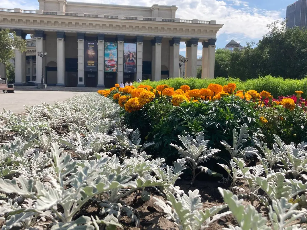 На троллейбусе мы ехали не более десяти минут. Именно с ЦУМа начинаются основные достопримечательности города. Рекомендую взять за ориентир Новосибирский государственный академический театр оперы и балета (НОВАТ), который будет хорошо видно практически по всему маршруту. По дороге к театру мы прошли управление железной дорогой, торговые и бизнес-центры, сквер «Крылья Сибири» и практически половину «Вокзальной магистрали» — так называется одна из центральных улиц города.