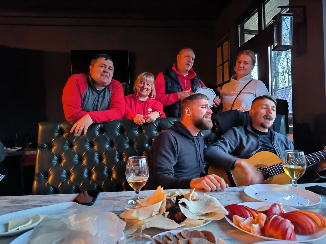 А с наступлением сумерек перебрались в кафе, где весь вечер нам пели наши инструктора Андрей и Роман, а также и хозяин турбазы Евгений.