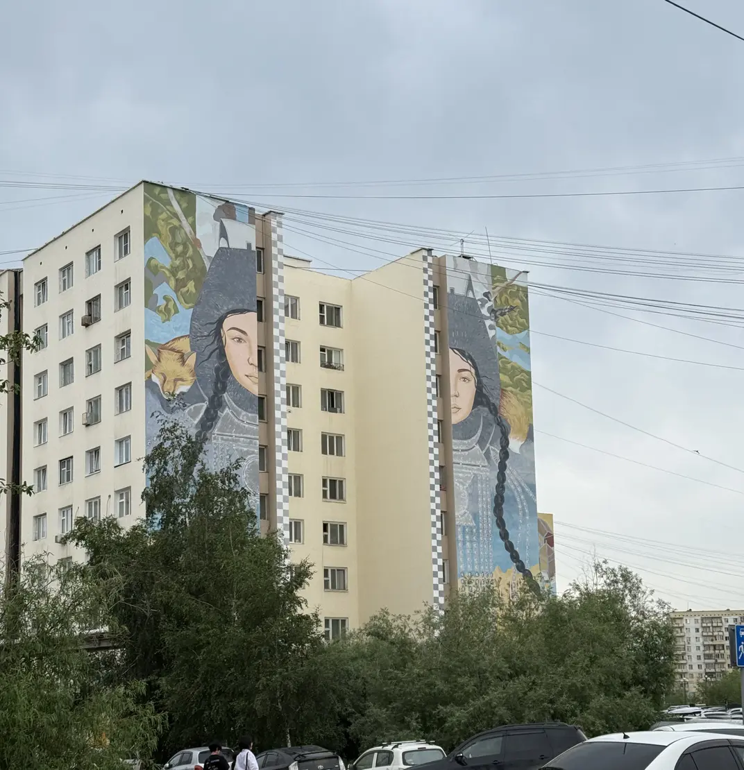 Дома построены с учетом особенностей суровых зим и снежного покрова — имеют высокий фундамент до уровня второго этажа, — многие украшены огромными портретами народа саха. Это смотрелось очень красиво, нас впечатлило.